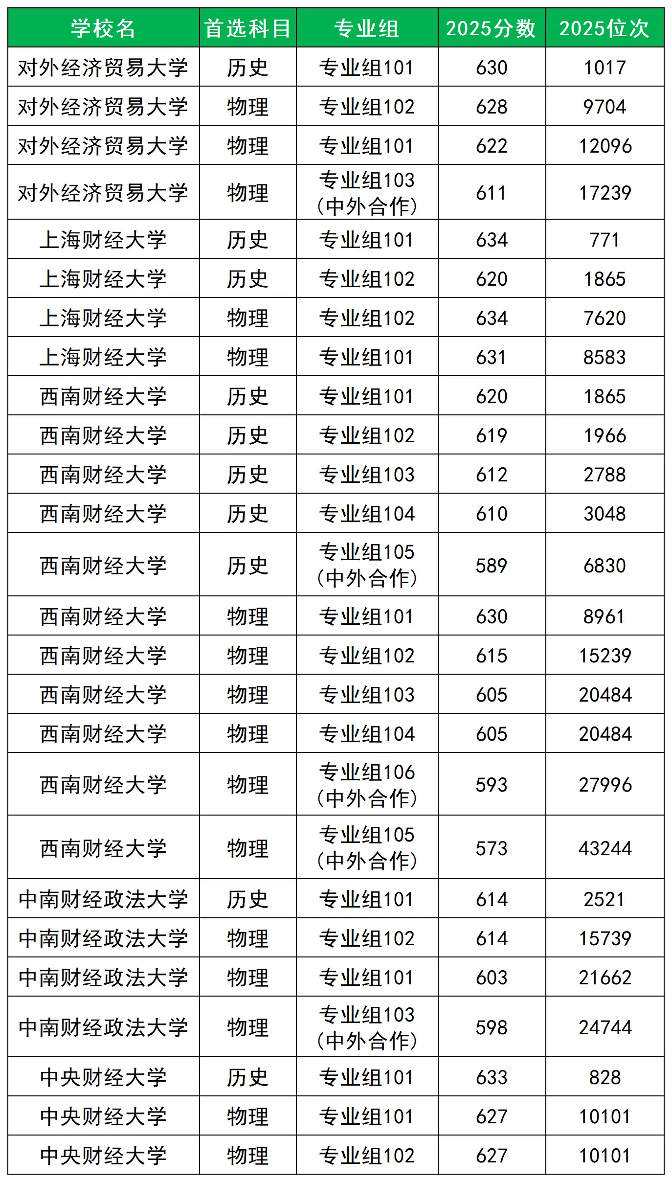 由下图可以看出这几所大学的分数并不低,以中央财经大学为例,2025年该校在四川历史组最低录取分数线为633分,高过了北京理工大学(最低录取分628分)、哈尔滨工业大学(最低录取分627分)、四川大学(最低录取分622分)等一众985大学。