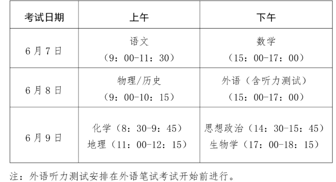 全国统考和普通高中学业水平选择性考试于6月7日至9日举行,具体科目考试时间安排为: