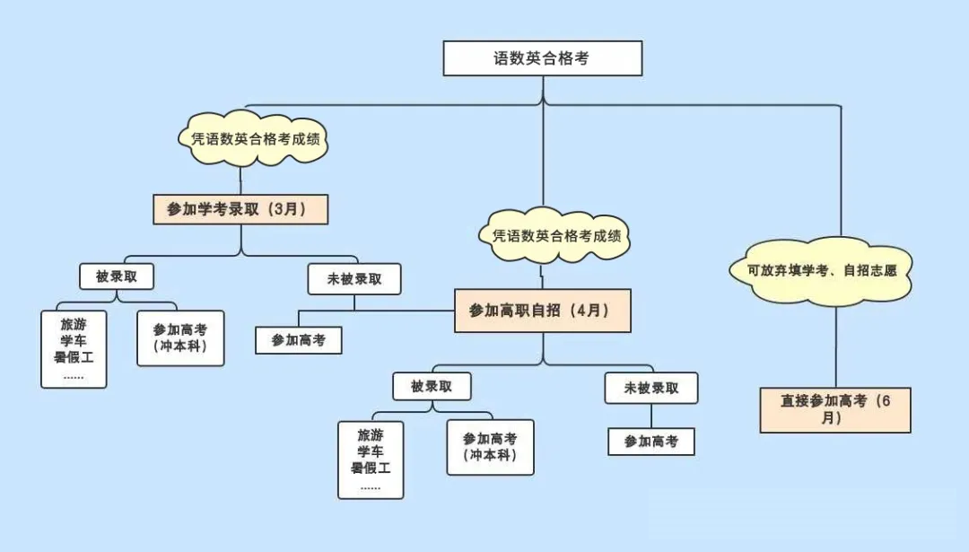 高中生想参加春季高考通过学考录取和高职自招这两条捷径提前被高职院校(即专科)录取,必须参加语数英学考。