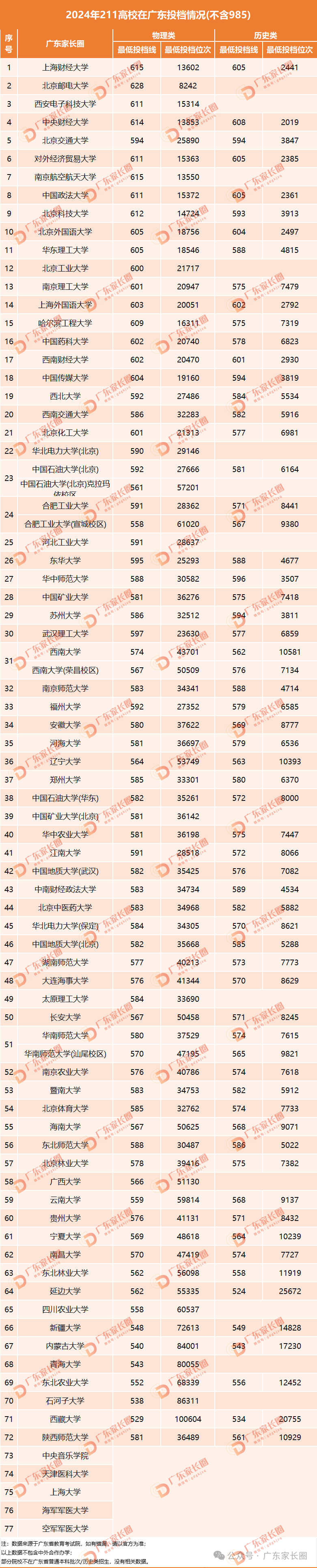 2024年广东高考本科录取阶段基本已经结束。今年211院校在广东省最低投档分数和省排位次是多少呢?广东家长圈整理了211院校在广东省2024年的最低投档分数和省排位次分析,新高三及更低年级考生重点参考!