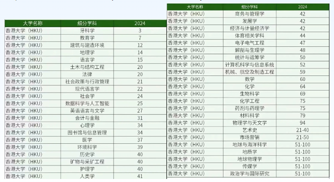 香港大学(2025QS排名17):港大在最新的学科排名中有49科上榜,7科跻身全球前20,牙科排名最高全球第3名,教育学排名全球第7名。