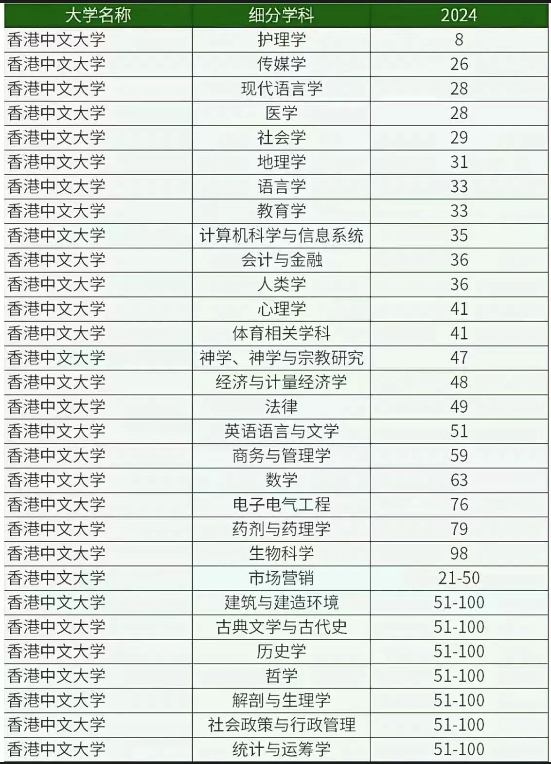 香港中文大学(2025QS排名36):港中文在最新全世界学科排名中有44个学科入榜,其中护理学排名最高,进入榜单前10。