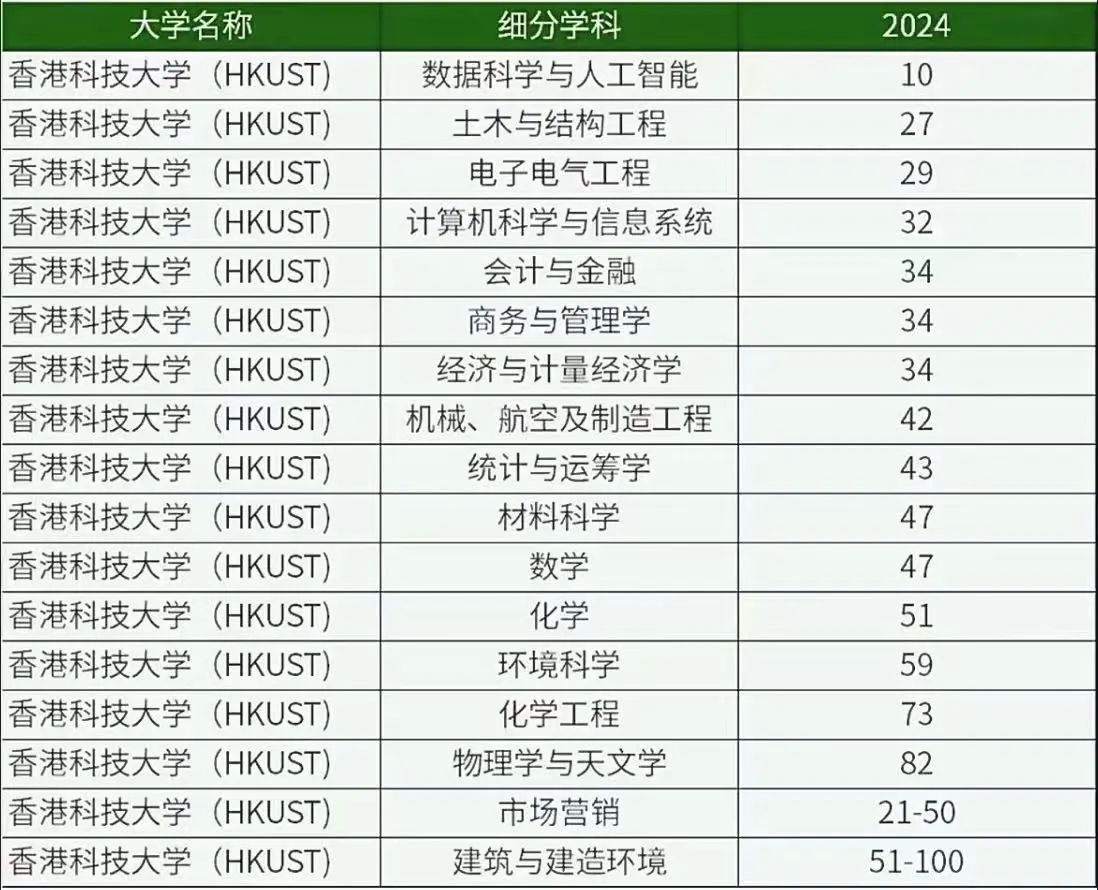 香港科技大学(2025QS排名47):港科大在最新全球学科排名中共有24个学科入榜,数据科学与人工智能排名最高,跻身前10。