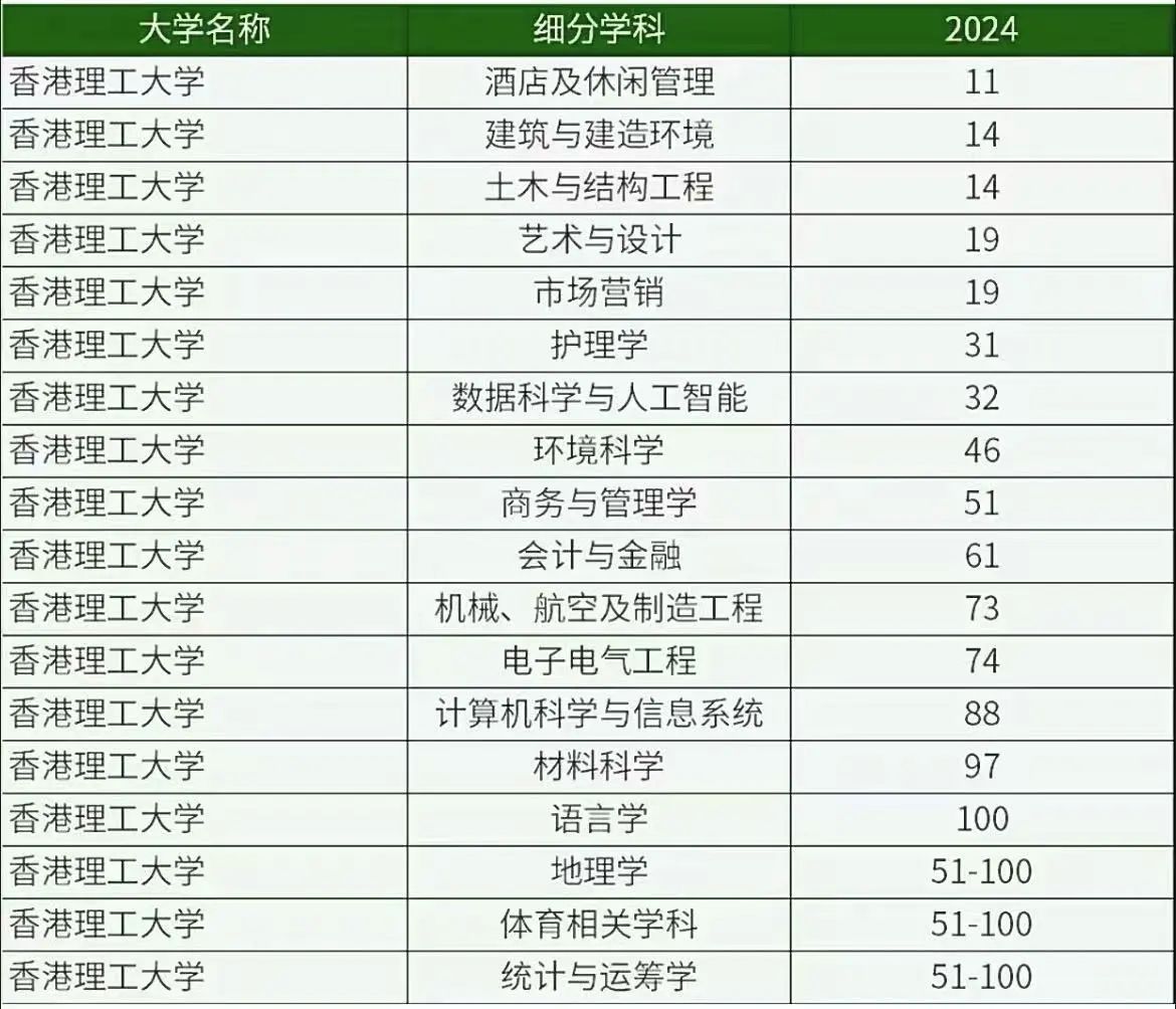 香港理工大学(2025QS排名57):港理工在最新全球学科排名中共有18个学科上榜,5科进入前20,排名最高的是酒店及休闲管理位居第11位。