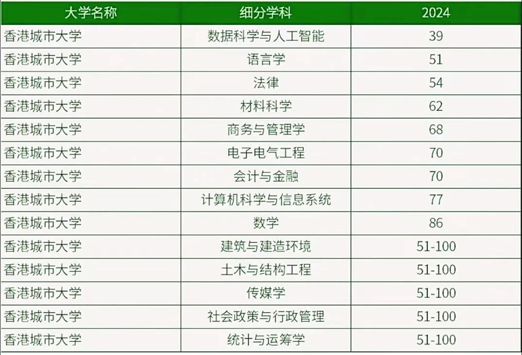香港城市大学(2025QS排名62):港城大共有14科榜上有名,排名最高的也是数据科学与人工智能,排名进入前50,位居第39位。