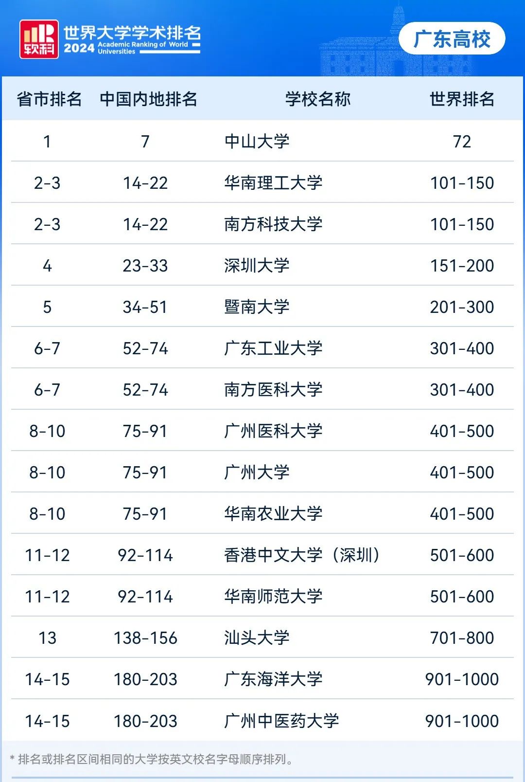 广东本省院校中全国排名中大第7(全球72名),华工19,南科大20。更有南方医科大学入围全球400强,深大持续位列全球500强。更多详情一起来看!