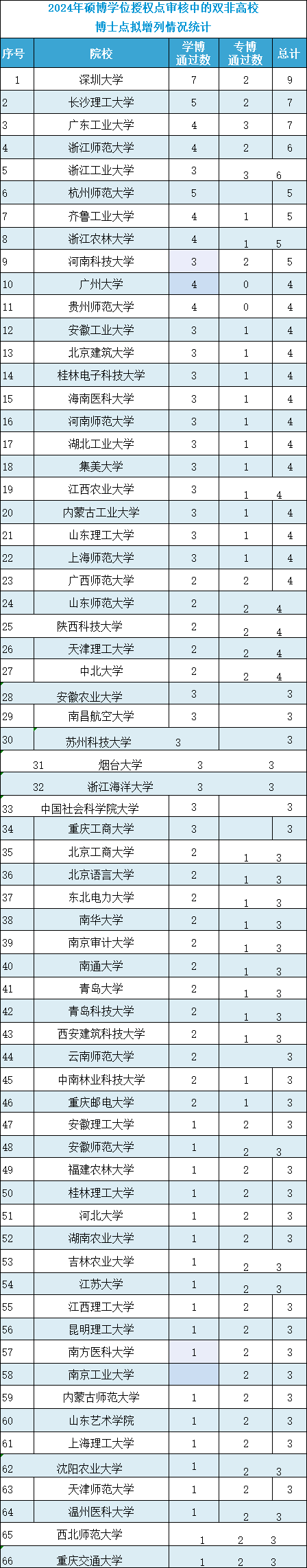 据统计,在本轮学位授权点审核中,约220所双非高校有博士点通过专家评议,拟增列博士点约460个。广东家长圈将博士点拟增列达到3个及以上的高校情况统计如下: