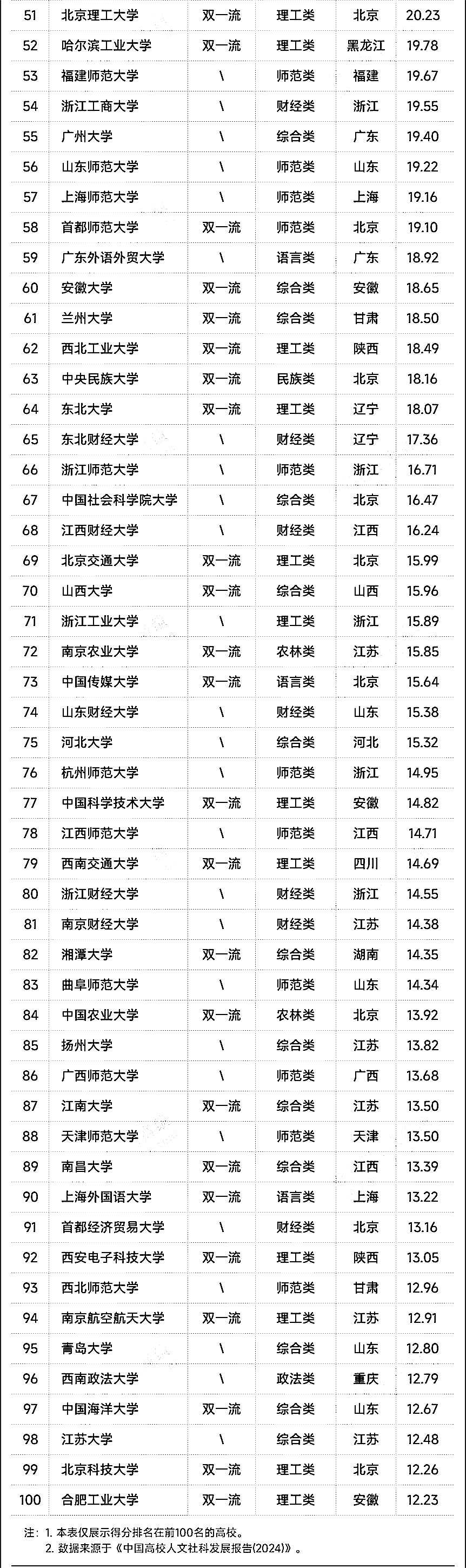 近日,《中国高校人文社科发展报告2024》发布。《报告》对中国1270所本科高校人文社科发展情况进行评价,并将综合得分降序排列,并公布排名前70%高校的综合得分。这一排名清晰映照出我国高等教育领域在人文社科方面的成就与挑战,为我们深入理解国家思维深度、精神状态及文明素质提供了宝贵的视角。下面让我们一起来看看2024中国文科实力TOP100都有哪些高校上榜