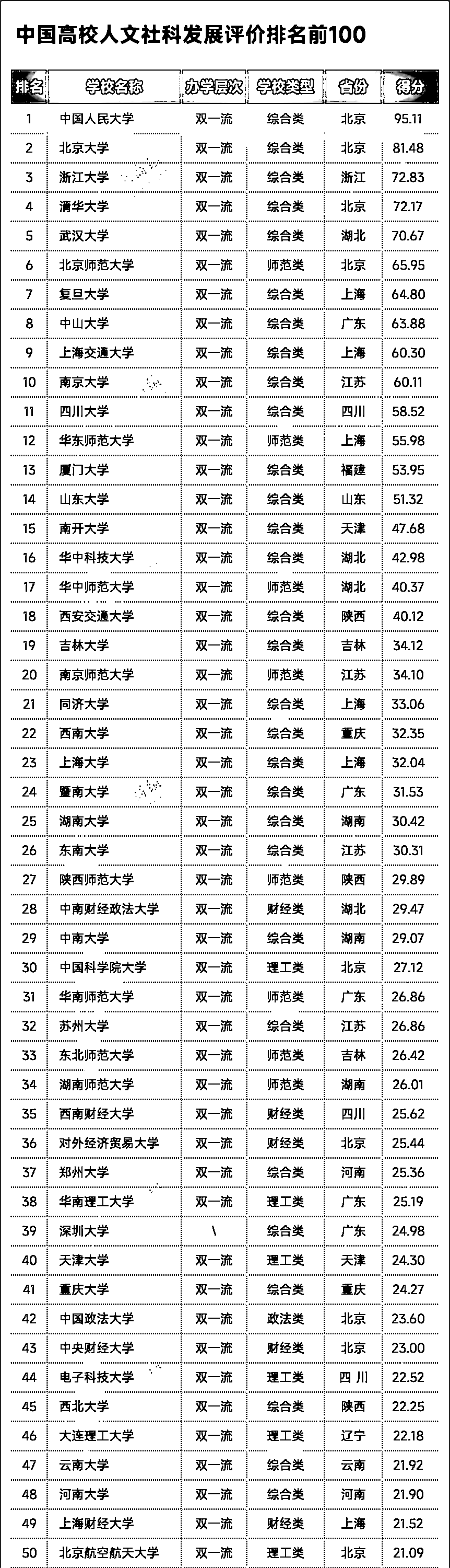 此外,进入前10强的高校依次还有:武汉大学、北京师范大学、复旦大学、中山大学、上海交通大学和南京大学,它们在文科方面都有着不俗的表现。