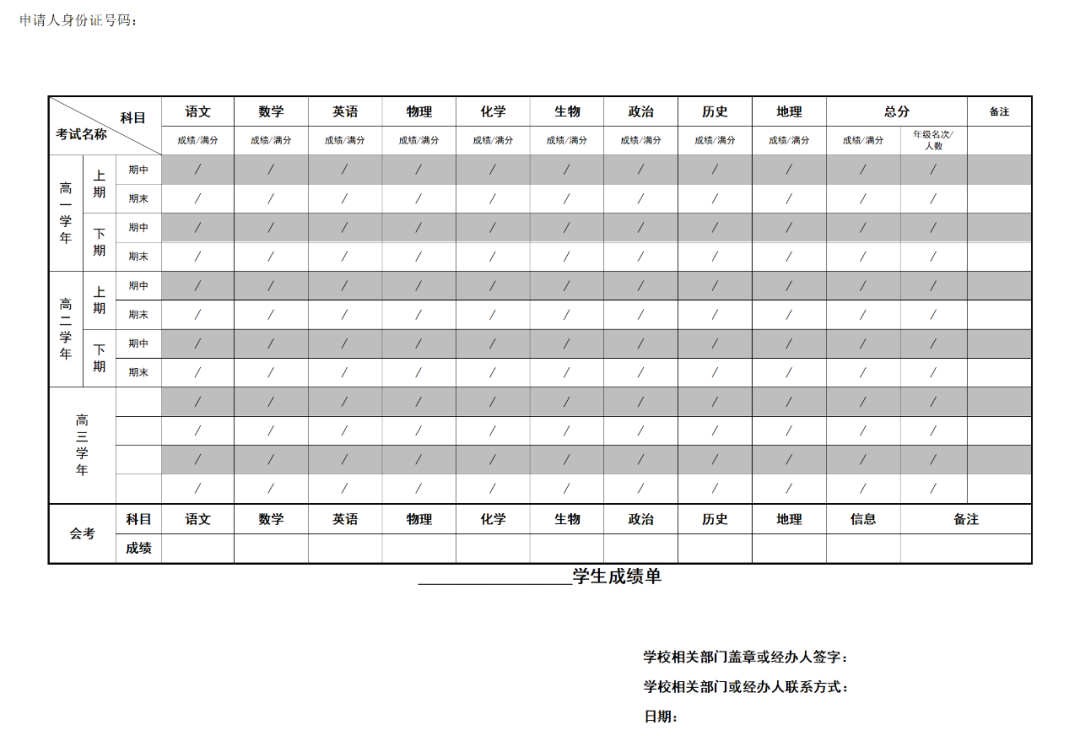 •如高中有既定的格式,以学校出具并加盖公章的成绩单为准。若学校没有既定格式,可下载附件成绩单模版,加盖学校公章。