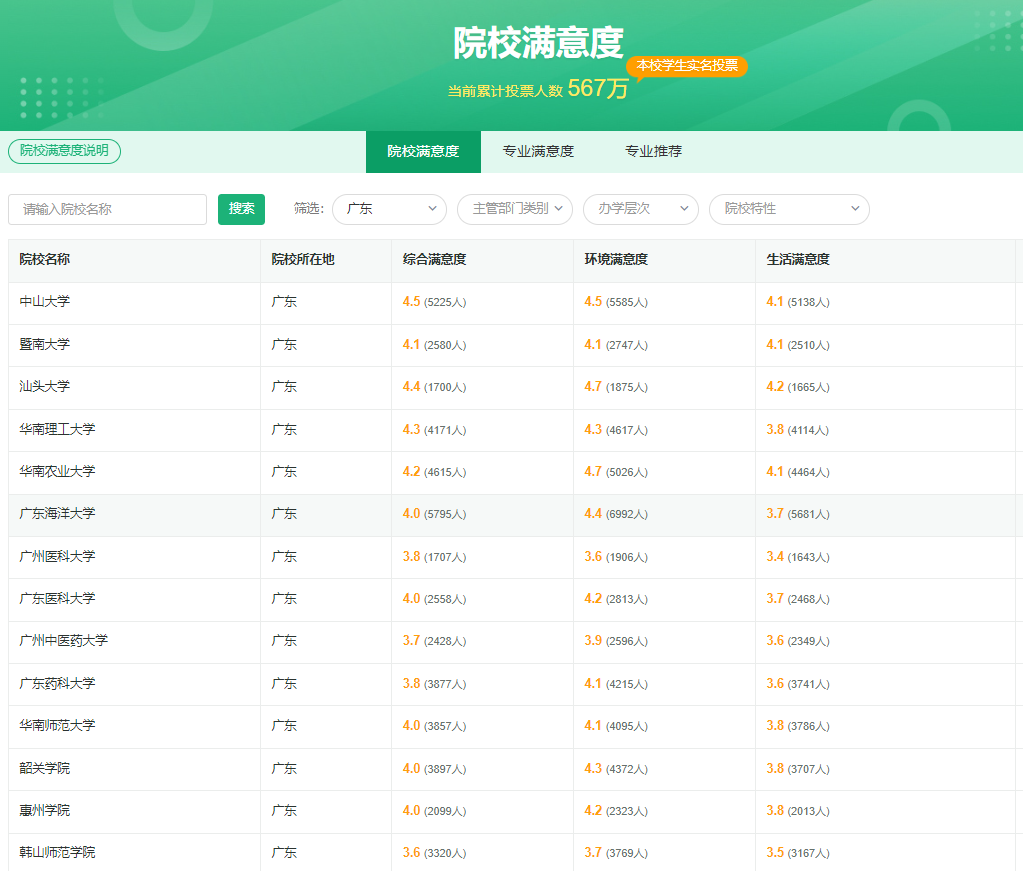 下面广东各个院校的排序是依据三项平均满意度并结合投票人数进行排序的满意度总分为5