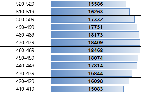 - 480-489分:人数超过1万8千人,每个分数的人数也都在1800人左右徘徊。