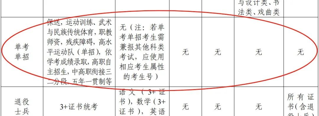 保送、运动训练、武术与民族传统体育、职教师资、残障(单招)、高水平运动队(单招)、高职自主招生、高职三二分段、依学考成绩录取、五年一贯制、消防救援(单招)属于单考单招类型,不参加夏季高考统考,采用考生属性为“6”的考生号报名。