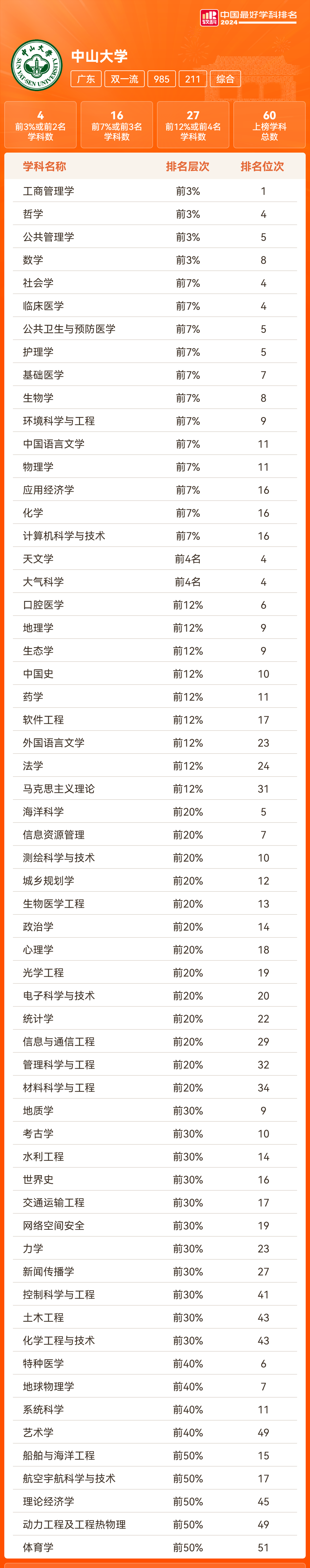 中山大学60个学科上榜2024年软科中国最好学科排名