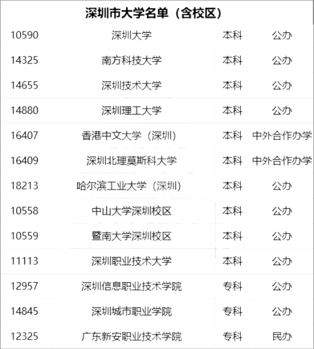 今年高考,新增2校招生——深圳理工大学、深圳城市职业学院。截至目前,深圳共有普通高校或校区13所(本科10所、专科3所),名单附后。
