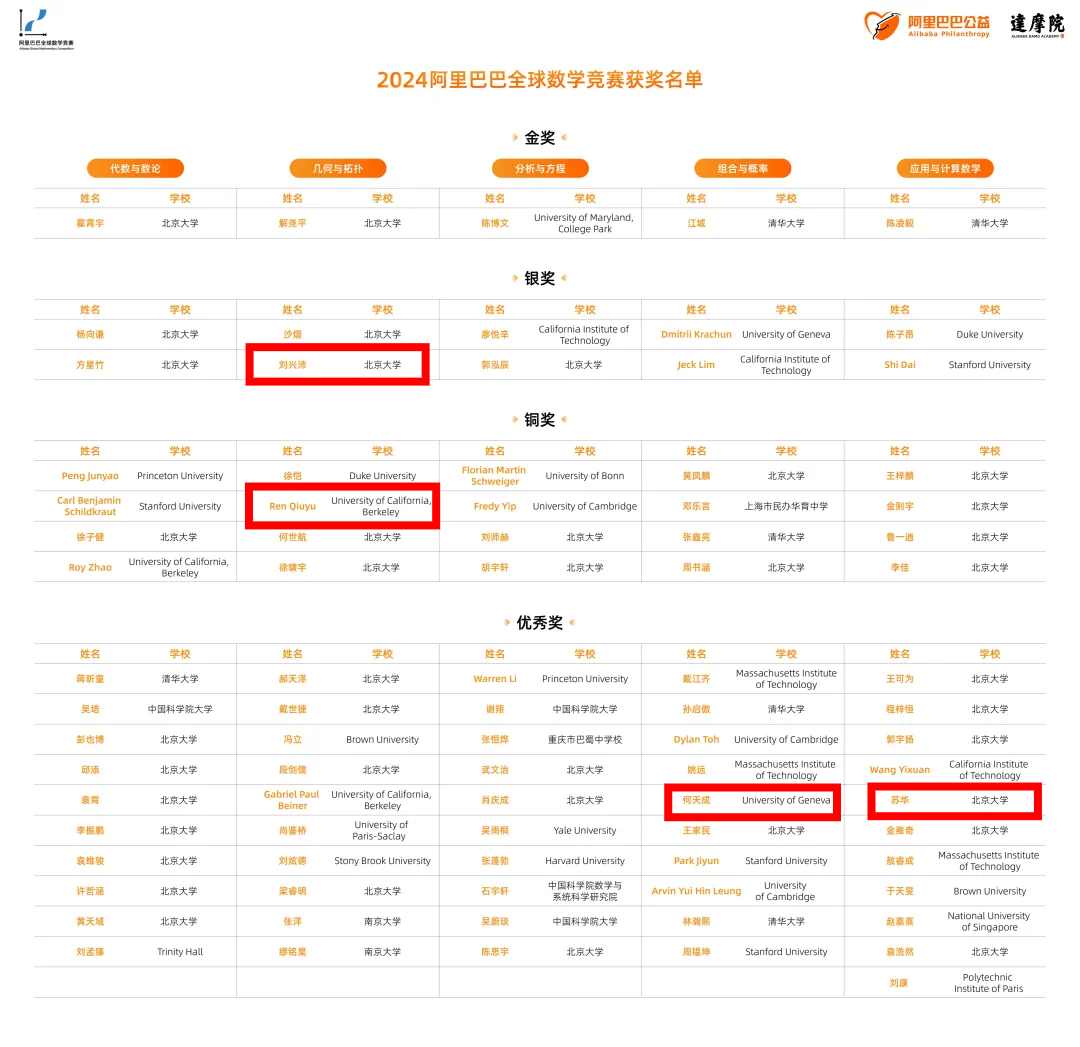 2024年11月3日,阿里巴巴达摩院官网发布了备受瞩目的《2024阿里巴巴全球数学竞赛获奖名单》,其中毕业于广东奥林匹克学校的四位不同学科的优秀校友赫然在列:刘兴沛(2018届)斩获银奖,RenQiuyu(任秋宇2017届)荣获铜奖,何天成(2017届)与苏华(2019届)分别摘得优秀奖。