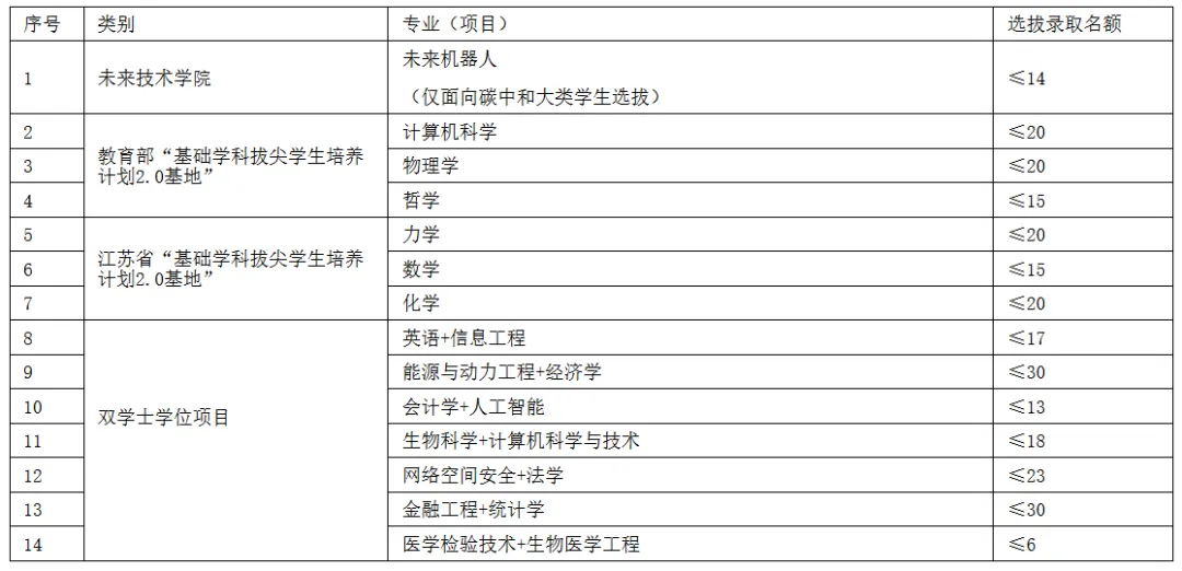 根据《东南大学2024级本科新生二次选拔公告》,结合各专业(项目)高考录取结果,现拟定选拔录取名额如下: