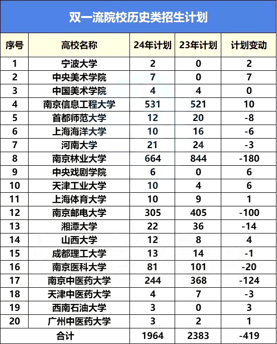 1.从整体计划数来看,双一流历史选科院校缩招明显,整体减少419个计划,特别是江苏当地院校,由于往年招生计划较多,缩招明显。但是历史类高考报名人数也在同步减少,所以不必过度紧张。