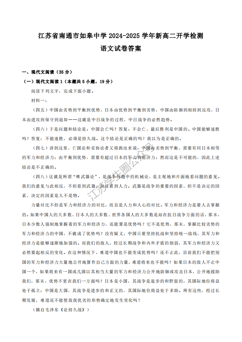 江苏省南通市如皋中学2024-2025学年新高二开学检测语文试卷答案
