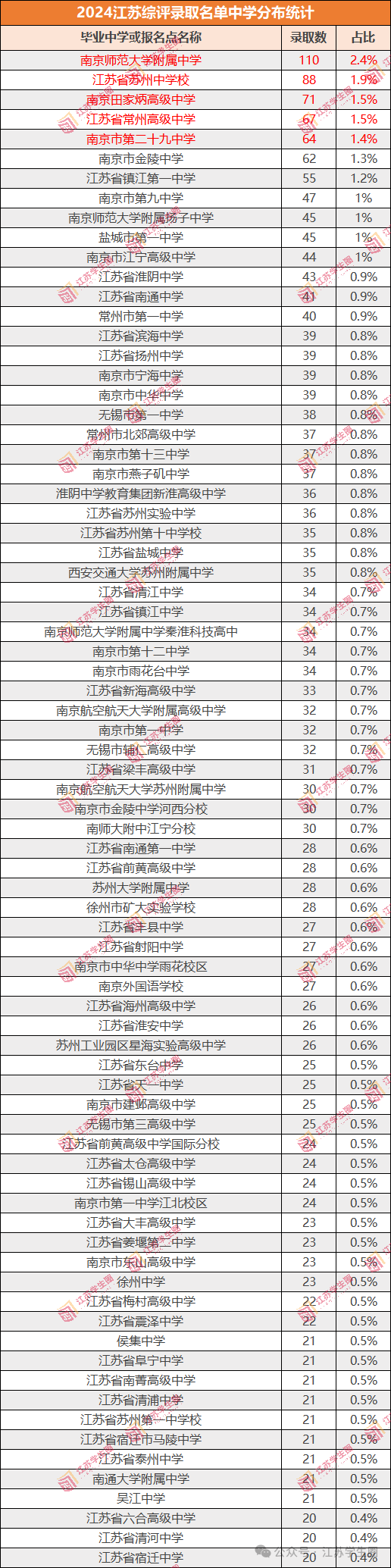 今年南师附中、苏中、田家炳高级中学、常州高级中学、二十九中录取人数位列前五、其中南师附中综评人数依旧排第一,不过与2023年(131)相比,减少21人;苏州中学增长22人,田家炳高级中学增长13人,常州高级中学增长9人,二十九中增长16人。中华中学去年共93人,今年加上分校区共66人,减少了27人。