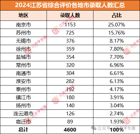 从上表可以看出:2024年综合评价录取人数最多的地市是南京1153人,苏州紧随其后725人,排名第三的无锡录取376人,排名最后的宿迁市录取人数仅89人。
