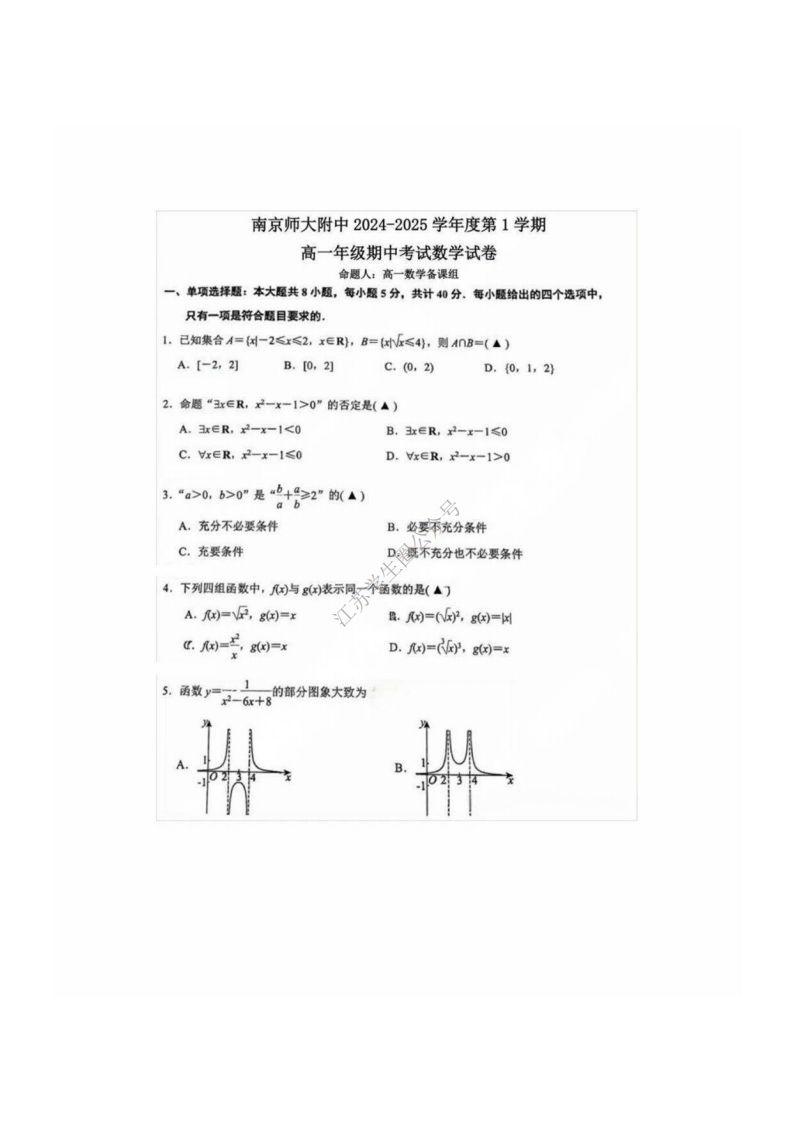 【数学试卷及答案】2024-2025南师大附中高一上学期期中考试