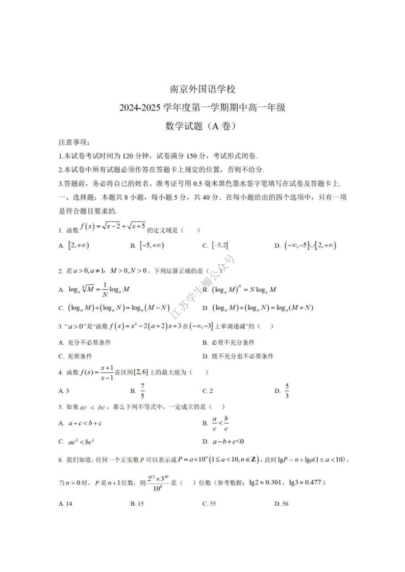 2024年11月南京外国语学校高一上学期期中考试于近期开考,自主选拔在线江苏新高考团队整理2024年11月南京外国语学校高一上学期期中考试数学试卷及答案以便考生参考!
