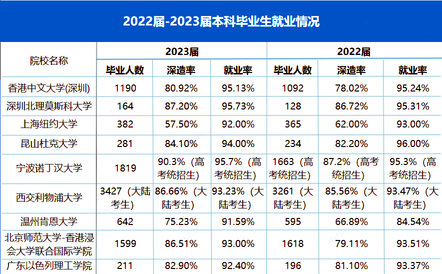 3.深造率高达57%及以上。从这些高校的2022届-2023届本科毕业生就业情况来看,深造率都在57%以上,部分高校更是高达90%,境外留学率也远超其他国内高校,未来准备出国留学的考生可重点关注报考。