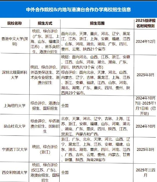 以下汇总整理了中外合作大学招生范围及2025年综合评价报名时间预测,如下图所示。
