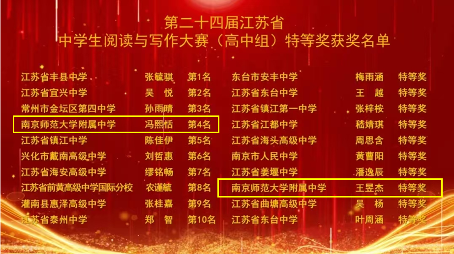 近日,第二十四届江苏省中学生阅读与写作大赛(高中组)在南京大学(鼓楼校区)落下帷幕。南师附中高三年级冯熙恬、王昱杰2位同学双双荣获特等奖(全省共20名),其中冯熙恬同学位居全省第四名。此外,南师附中张聿景、王馨同、姜仪、季昕昊4位同学获大赛一等奖。自主选拔在线江苏新高考团队整理相关名单,欢迎考生参考!