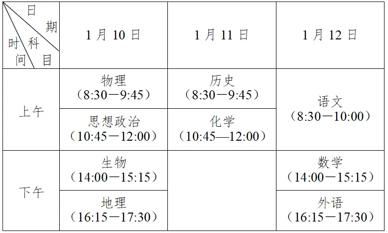 考试时间为2025年1月10日—12日。除语文科目考试时长为90分钟外,其他各科均为75分钟。具体如下: