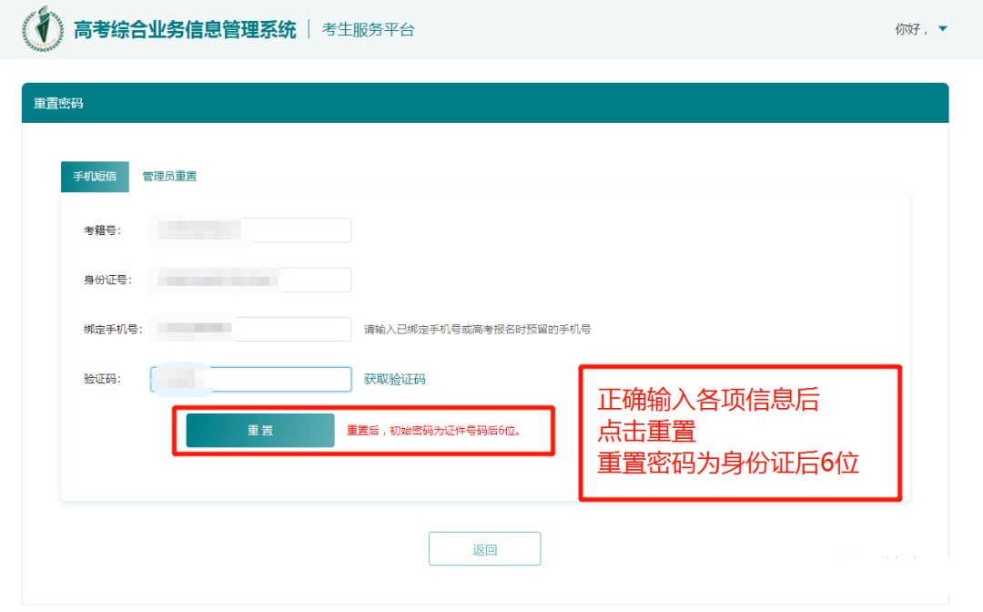进入界面后,按照提示,输入正确的考籍号、身份证号、绑定手机号及验证码。重置成功后,密码为身份证号后6位。