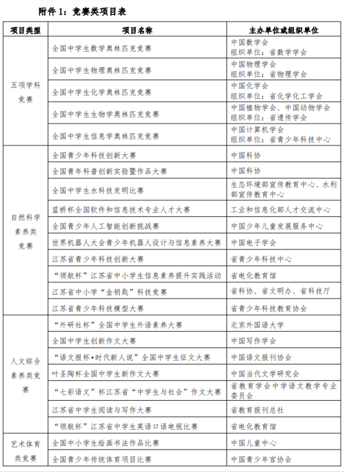 (1)竞赛类:高中阶段参加全国中学生五项学科竞赛(数学、物理、化学、生物学、信息学)获得省级赛区三等奖及以上;或者自然科学素养类、人文综合素养类、艺术体育类竞赛获得省级赛区一等奖及以上。
