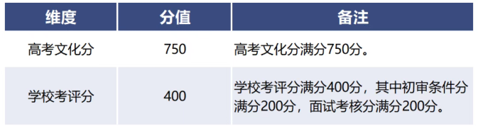 我校根据考生的高考文化分、学校考评分等维度进行多元加权综合评价,形成综合评价分,评价方法如下:
