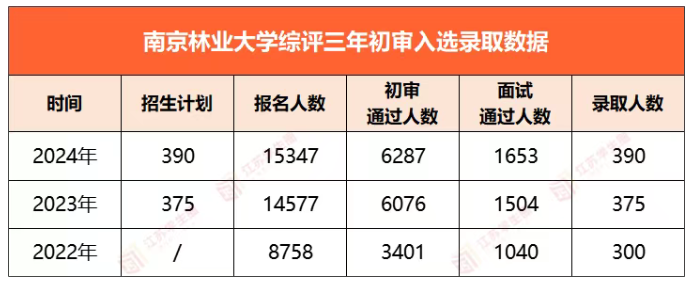 南京林业大学近两年报名人数较多,2023年新增了5819名同学报名,2024年新增了770名同学报名,共有15347人报名,初审通过人数为6287人,初审通过率为40.97%,面试通过人数为1653人,面试通过率为10.77%,最终录取人数为390人,最终录取率为2.54%。南京林业大学考评分满分400分,其中初审条件分满分200分,面试考核分满分200分,2024年考评分最高为342.333分,考评分300分以上的有13位同学,学校考评分第400名的同学考评分为221.667分,学校考评分第500名的同学考评分为216分,考评分5分集中了100人,可见在高分段人数较少,低分段人数较为集中。