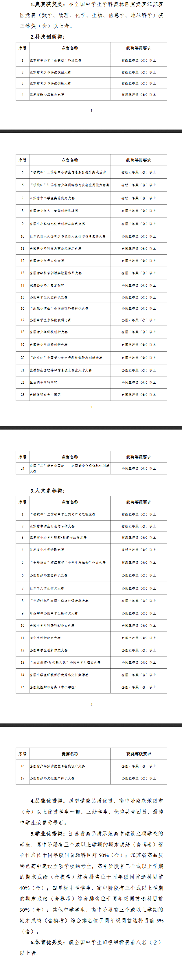 已参加江苏省当年普通高等学校招生全国统一考试报名,思想品德优良、身心健康,具有明显专业兴趣、学科特长和创新潜质,且在高中阶段获得下列6项之一可申请报考: