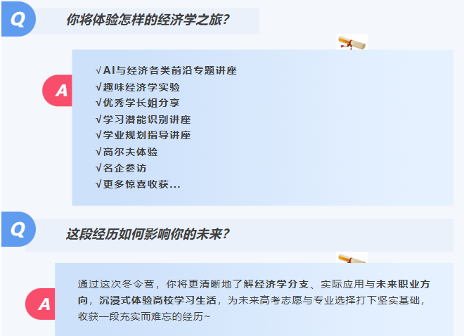 选科像迷宫?专业选择像开盲盒?本次冬令营特别开设学习潜能识别和学业规划指导讲座。还有厦门大学经济学科的优秀学长学姐面对面分享他们的成长历程、大学生活趣事以及实战经验。一次选择,影响四年,这些讲座让你做的每个决定都精准命中目标!