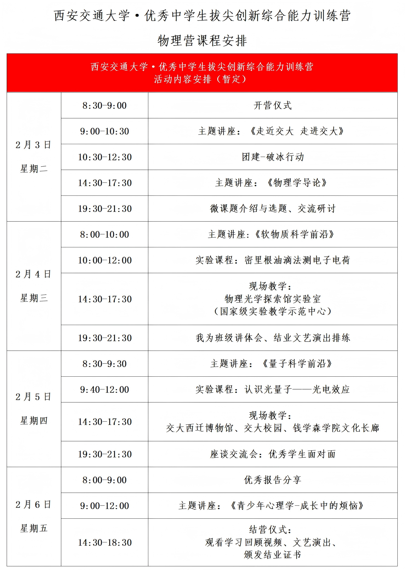 西安交通大学优秀中学生拔尖创新综合能力训练营是由著名的钱学森学院所主办的,旨在培养中学生的创新思维和综合能力。目前,备受瞩目的物理营已经正式启动报名程序,报名截止日期为2026年1月1日。下面,让我们一同详览西交大物理营的招生简章,解锁此次训练营的诸多亮点与细节!