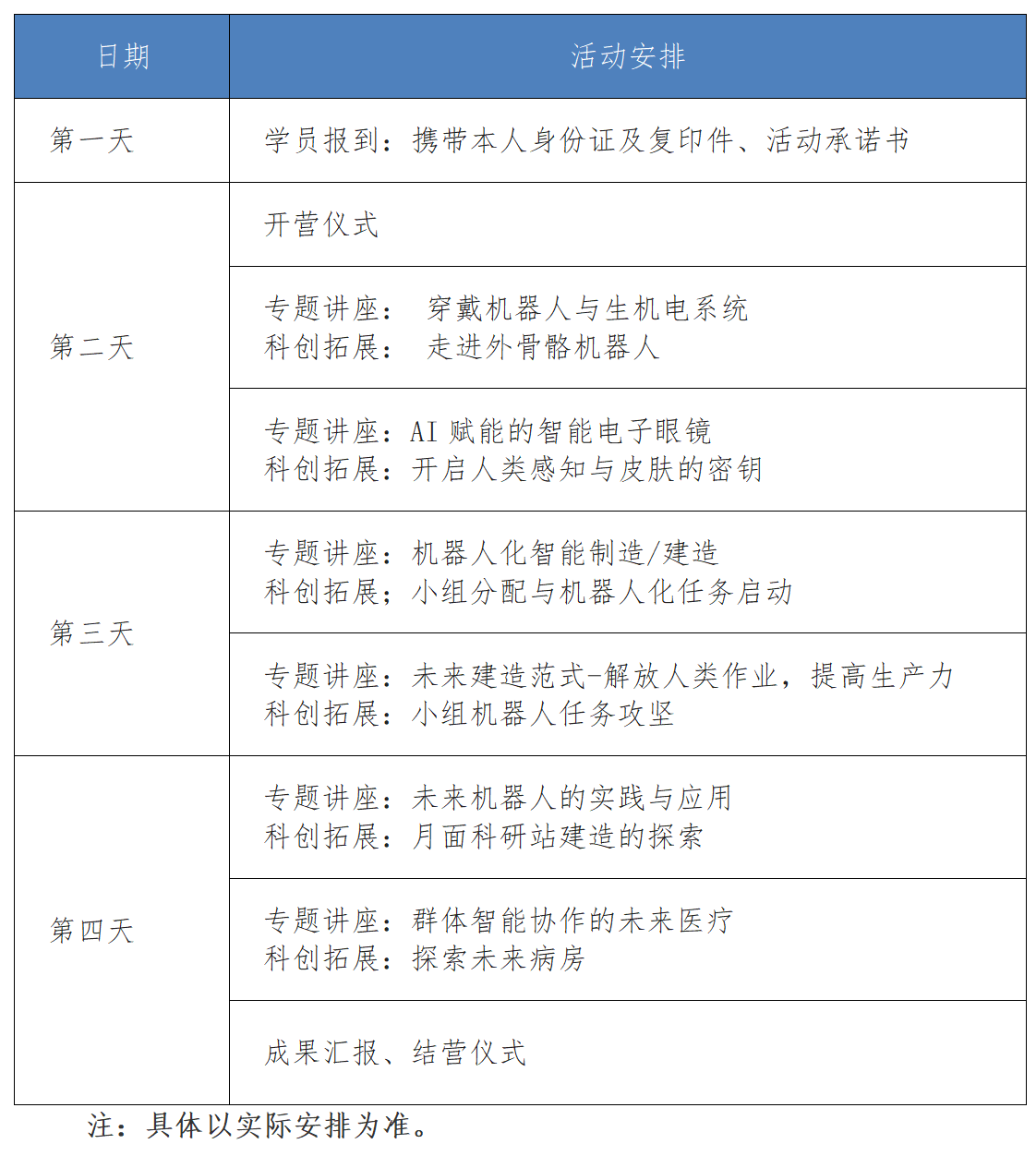 “机器人线下研学营”由同济大学机械与能源工程学院具体实施,依托学院牵头建设的国家级机械实验教学示范中心、穿戴机器人与人机交互技术上海市重点实验室开展活动,旨在让学员感受机器人与先进制造领域的魅力,了解机器人领域的相关知识与实验技能。学员将走进两大实验室,同时聆听前沿报告,在导师指导下完成基于机械设计、智能控制等原理的机器人科技创新项目,参与机器人结构搭建与调试、人机交互系统开发实验,提升创新意识与解决问题能力,收获成长。