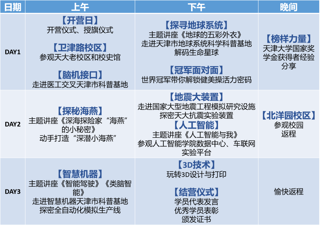 依托天津大学优势学科资源,整合人工智能学院、地球系统科学学院、电气自动化与信息工程学院、机械工程学院、医学院、建筑工程学院资源,与世界冠军领略健美操的魅力,与国奖学霸交流学习经验,校史馆与双校区参观,感受天津大学130周年历史,3天沉浸式研学,解锁硬核科技与榜样力量的双重赋能!