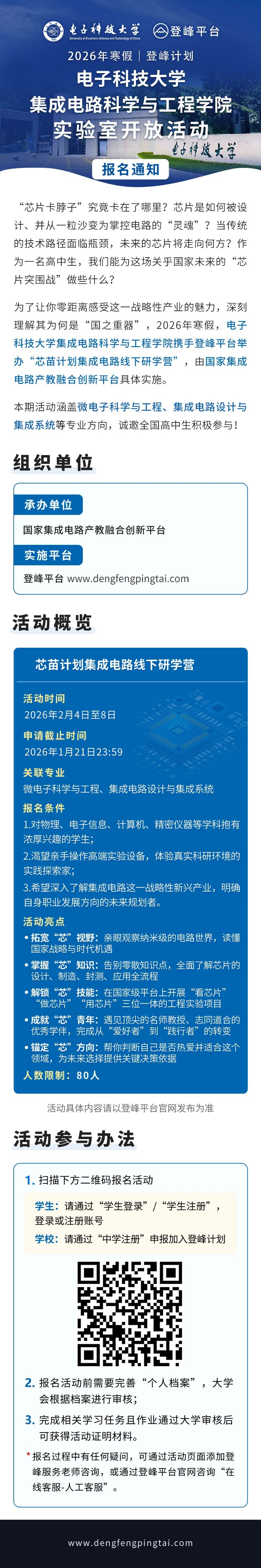 2026年寒假,电子科技大学集成电路科学与工程学院携手登峰平台举办"芯苗计划集成电路线下研学营",由国家集成电路产教融合创新平台具体实施。本期活动涵盖微电子科学与工程、集成电路设计与集成系统等专业方向,诚邀全国高中生积极参与!