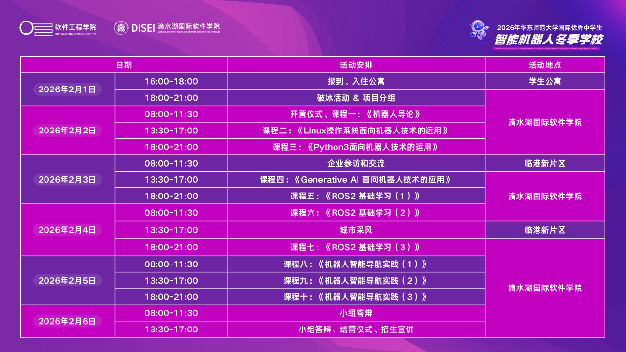 为充分发现和培养具备创新思维与实践能力的未来科技人才,满足高新技术产业对复合型人才的需求,同时推动人工智能、具身智能与智能制造等前沿领域的发展与国际合作,华东师范大学软件工程学院(滴水湖国际软件学院)计划于2026年2月1日(报到日)至2月6日(六天五晚)期间举办国际优秀中学生智能机器人冬令营,一起来看具体内容!