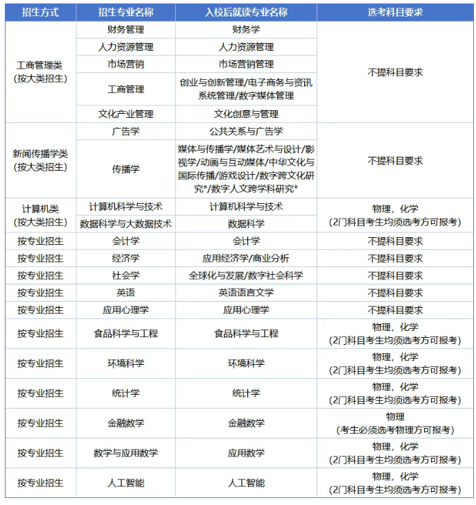 (2)北师港浸大的大类招生专业分流工作坚持以生为本、志愿优先、择优选拔,原则上在第一学年第二学期开始前完成专业确认,让学生在第二学期按相关专业的培养方案开始专业学习。学生入学后可深层次了解各学科和专业,依据自己的兴趣、特长、学习情况,自主填报分流专业志愿。各学院专业分流评审小组,将从个人意愿、个人能力、学业成绩、个人作品集、个人陈述、小组面试、老师评价七项标准中,挑选若干项作为本招生大类专业分流的选拔标准,综合确定专业分流名单。学校招生计划、选考科目要求最终以广东省招生办公布的2026年普通高校招生专业目录为准。