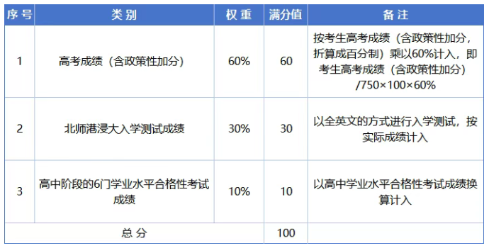 综合评价录取总成绩满分为100分,按四舍五入,保留四位小数计算。其中,高考成绩(含政策性加分,折算成百分制)占综合成绩的60%;北师港浸大入学测试成绩满分为30分,按实际成绩计入;考生高中阶段的思想政治、历史、地理、物理、化学、生物学6门学业水平合格性考试科目成绩均须达到合格,并按以下等级折算办法计入学业水平合格性考试成绩:按照A等级对应10分、B等级对应9分、C等级对应8分、D等级对应7分计算各科目得分,考生高中学业水平合格性考试计入综合评价录取成绩=各科目等级分总和/6。