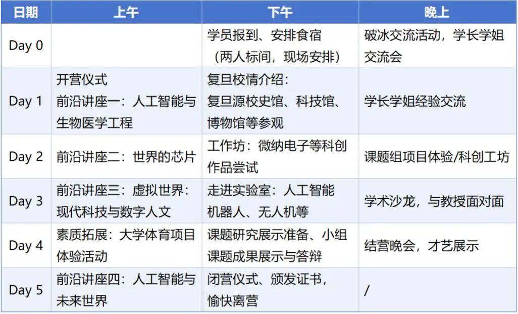 服务国家创新驱动发展战略,应对新一轮科技革命与产业变革,复旦大学聚焦“新工科”建设,致力于培养兼具前沿科学视野、卓越工程创新能力、多学科交叉融合能力的未来科技领袖。在新时代人才培养体系中,中学与大学教育的有机衔接尤为关键。复旦大学始终积极推动大中衔接育人实践,将“新工科”的前沿理念向中学阶段延伸,引导优秀学子早立志、早探索、早成长。本体验营旨在为全国优秀高中生提供零距离接触复旦新工科相关前沿领域、感受顶尖学术氛围、体验大学生活的高端平台。通过精心策划的深度研学旅程,激发营员的科学兴趣与创新潜能,助力其提前规划大学生涯与人生愿景。