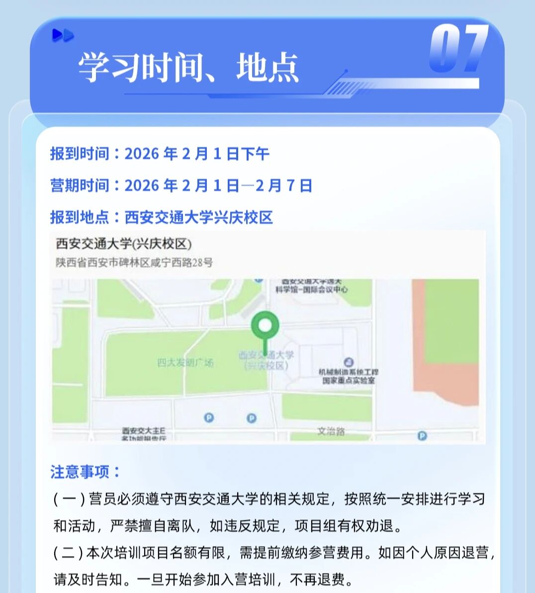 2026年西安交通大学优秀中学生科技冬令营招生简章现已发布,营期时间为2026年2月1日一2月7日。本次活动旨在吸引那些品学兼优,且对科技与人工智能怀有深厚热情的中学生参与。如果你对此充满兴趣,以下是本次西交大冬令营招生简章的具体内容,敬请查阅。