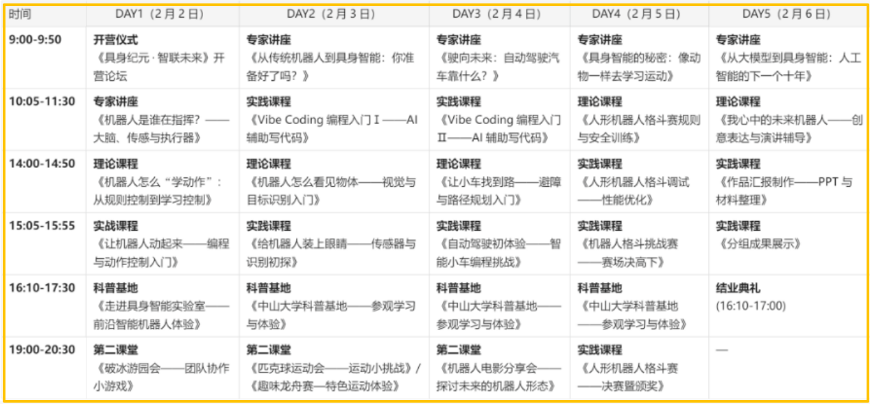 从机器人控制原理到机器人格斗,从AI辅助编程到具身智能前沿,每日设置“专家讲座 + 理论课程 + 实践操作”三重学习环节,帮助学员系统理解科技原理并动手实现创意。