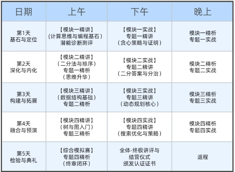 培养模式:采用“精准诊断+跨日精进”模式。始于深度能力诊断,随后进入“下午专题精讲→晚上高阶实践→次日上午思维升华”的深度循环,评估其在挑战性环境中的思维韧性与突破上限。