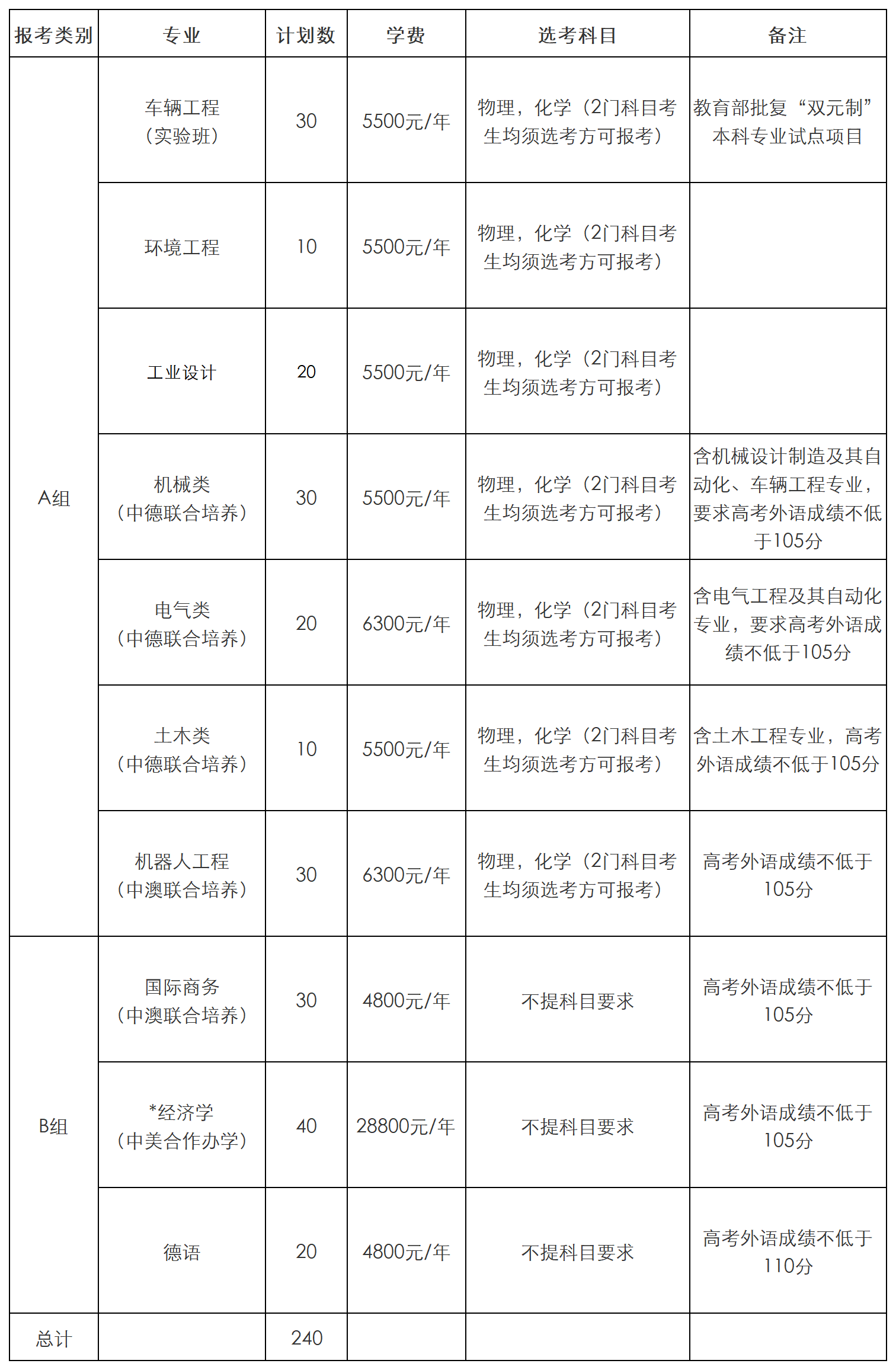 报考机械类(中德联合培养)、电气类(中德联合培养)、土木类(中德联合培养)、机器人工程(中澳联合培养)、国际商务(中澳联合培养)、经济学(中美合作办学)的考生外语单科成绩不低于105分,报考德语专业外语单科成绩不低于110分。其中中澳联合培养项目、中美合作办学专业教学培养使用的外语语种为英语;中德联合培养项目、德语专业教学培养使用的外语语种为德语;其他专业外语公共课为英语或日语。