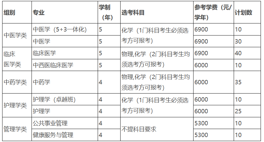 第十三条 2026年三位一体综合评价招生工作面向浙江省招生,总计划数180名。学校将招生专业分为中医学类、临床医学类、中药学类、护理学类和管理学类5个组别。考生只能选报其中1个组别,不能兼报。具体报考专业组别、包含专业、计划数及报考相关专业所需的选考科目要求如下表: